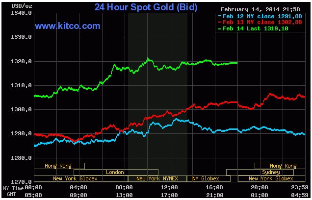 Giá vàng giao tháng 4 đã tăng 1,4% ngày hôm qua lên 1.318,6 USD/ounce trên sàn Comex. Lũy kế cả tuần, giá tăng 4,4%, mạnh nhất kể từ 16/8/2013.
