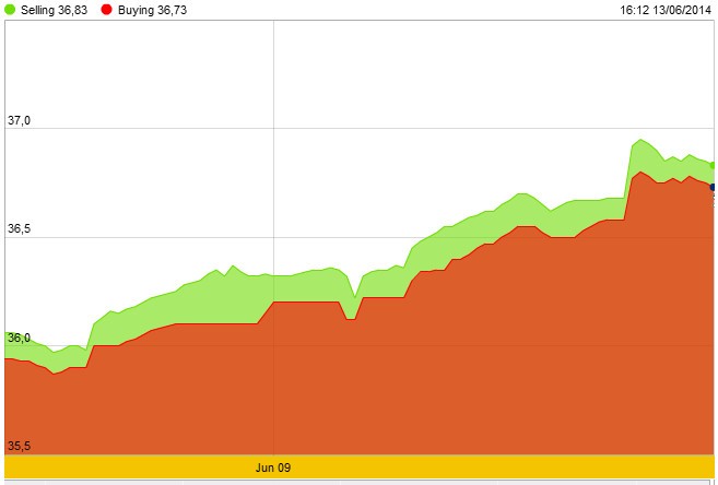 Tại thị trường trong nước, giá vàng SJC hôm nay tiếp tục tăng lên mức cao trong vòng hơn 3 tuần với 36,80 - 36,95 triệu đồng/lượng. Đến 5h chiều, giá vàng thương hiệu quốc gia giảm nhẹ còn 36,73 - 36,83 triệu đồng/lượng. Vàng SJC đang hướng đến 1 tuần tăng đầu tiên sau 2 tuần giảm liên tiếp.