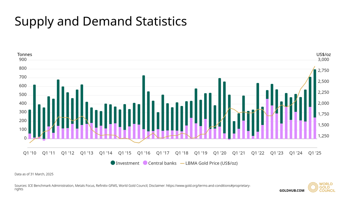 Ở khía cạnh đầu tư, dòng tiền chảy vào các quỹ ETF vàng đã trở lại mạnh mẽ. Riêng quý I/2025, lượng tiền vào ETF vàng đã đạt gần 50% tổng dòng tiền của cả năm 2024, đảo ngược hoàn toàn xu hướng bị rút ròng trong cùng kỳ năm trước. Ban đầu, dòng vốn này chủ yếu đến từ khu vực Bắc Mỹ do các nhà đầu tư phản ứng với chính sách áp thuế mạnh tay của Mỹ lên các đồng minh như Canada, EU, Mexico. Tuy nhiên, trong các tháng gần đây, dòng tiền từ châu Á, đặc biệt là Trung Quốc và Ấn Độ, đang nổi lên rất mạnh mẽ. Tháng 4/2025, sau sự kiện Mỹ áp thuế đối ứng ở mức cao chưa từng có, dòng tiền vào ETF vàng đạt mức cao nhất lịch sử theo tháng.