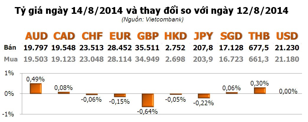 Với các ngoại tệ khác, GBP, AUD và THB biến động đáng kể. Trong đó, GBP giảm 0,64%; AUD tăng 0,49% và THB tăng 0,30%.