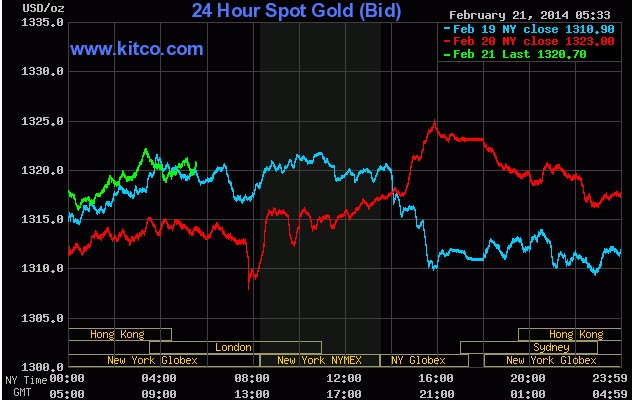 Giá vàng giao ngay đã giảm tiếp về đêm qua trên thị trường Mỹ trước khi tăng trở lại trong ngày hôm nay trên thị trường châu Á. Mức thấp nhất trước khi tăng là 1.315,9 USD/ounce. Đến 15h17, theo giờ Việt Nam, giá được giao dịch ở mức 1.322,5 USD/ounce. Từ đây, giá lại quay đầu giảm, còn 1.320,8 lúc 4h50.