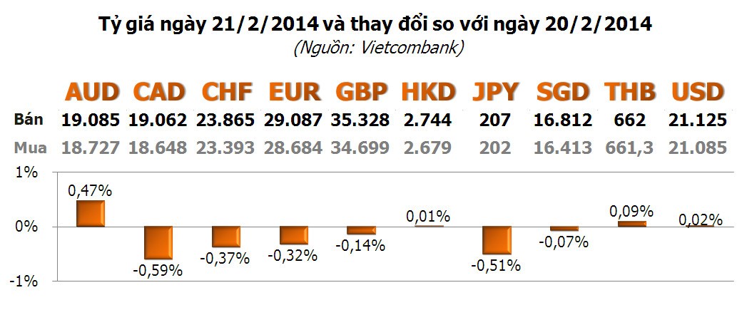 Với các ngoại tệ khác, đa số giảm so với chiều qua, trong đó CAD giảm mạnh nhất với -0,59%; tiếp theo là JPY với -0,51%; CHF với -0,37%... Ở chiều ngược lại, chỉ AUD tăng đáng kể với 0,47%.
