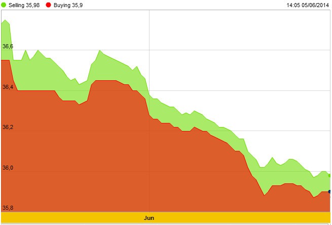 Vàng đã giảm lần thứ hai trong vòng 3 tháng trong tháng 5 khi đồng euro giảm 1,7% so với đồng USD do thị trường dự đoán ECB sẽ bổ sung biện pháp kích thích tiền tệ. Dữ liệu ngày mai có thể cho thấy Mỹ đã có thểm 215.000 việc làm trong tháng 5. Hôm qua, một báo có cho thấy lĩnh vực dịch vụ đã tăng trưởng nhanh nhất trong vòng 9 tháng và điều này đã giúp chỉ số S&P 500 tăng lên mức cao kỷ lục mới.