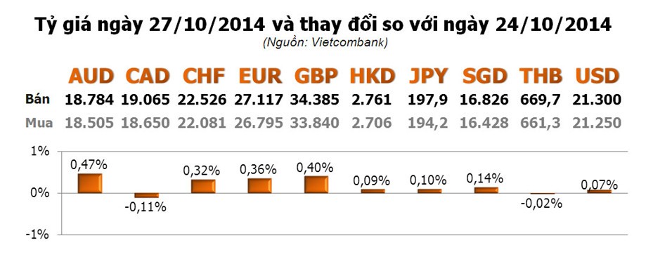 Các ngoại tệ khác, hầu hết tăng, trong đó dẫn đầu là AUD với 0,47%; tiếp đến là GBP với 0,40%; EUR với 0,36%...