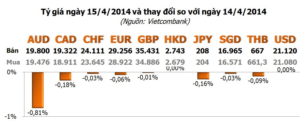 Với các ngoại tệ khác, hầu hết giảm, trong đó AUD giảm mạnh hơn hẳn với -0,81%. Các ngoại tệ còn lại giảm từ 0,18% trở xuống.
