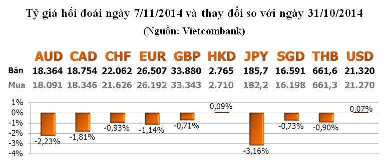 Các ngoại tệ khác toàn bộ giảm. Trong đó, JPY giảm mạnh nhất với -3,16%; tiếp theo là AUD với -2,23%; CAD với -1,81%; EUR với -1,14%...