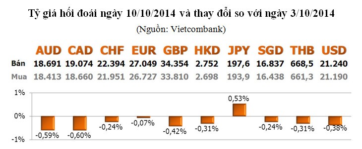 Với các ngoại tệ khác, ngoại trừ JPY tăng 0,53%, còn lại giảm. Giảm mạnh nhất là CAD với -0,60%; tiếp đến là AUD với -0,59%; GBP với -0,42%...