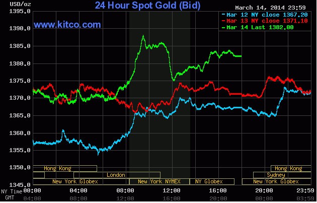 Giá vàng giao tháng 4 đã tăng lên hôm thứ Sáu tuần qua, chốt lại ở mức 1.379 USD/ounce trên sàn Comex, tăng 3% so với tuần trước đó. Giá vàng giao ngay chốt tuần ở mức 1.382 USD/ounce.