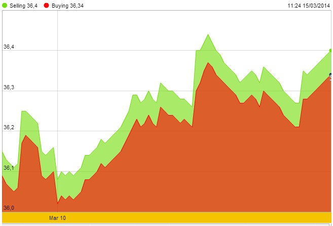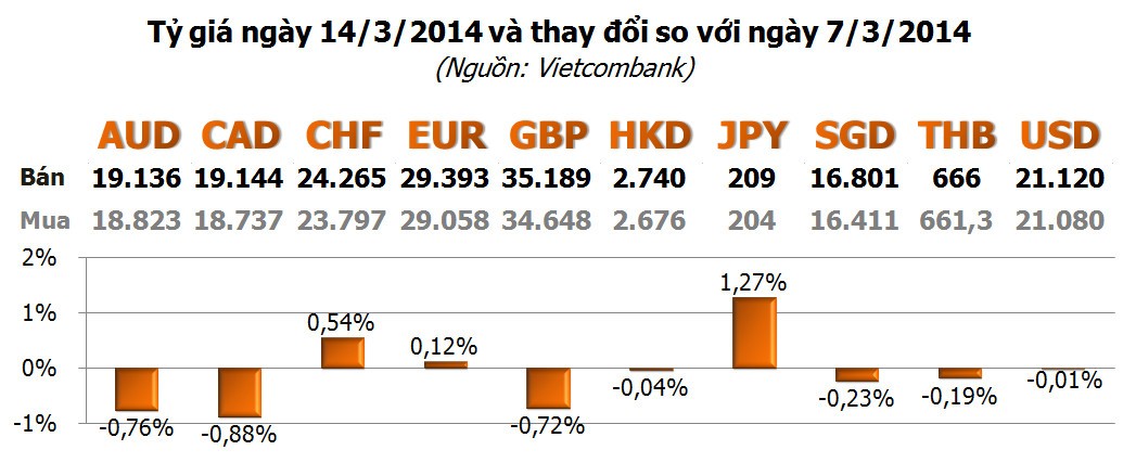 Tuần qua, giá USD trên thị trường tự do đã có lúc giảm xuống thấp nhất kể từ đầu tháng 11/2013 vào ngày 13/3, với 21.090 - 21.110 đồng/USD, thấp hơn cả giá USD do Vietcombank niêm yết bán ra là 21.120 đồng/USD. Tuy nhiên, đến ngày cuối tuần 14/3, giá tăng trở lại lên 21.110 - 21.130 đồng/USD, bằng với đầu tuần và cuối tuần trước đó.