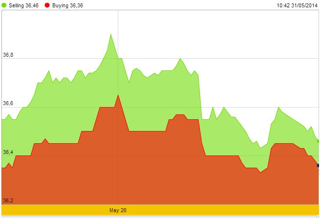 Giá USD do Vietcombank niêm yết tăng đến 21.145 - 21.195 đồng/USD vào ngày 29/5, cao nhất kể từ ngày 27/8/2013. Tuy nhiên, giá đã giảm trở lại 15 đồng/USD vào ngày cuối tuần, còn 21.130 - 21.180 đồng/USD.