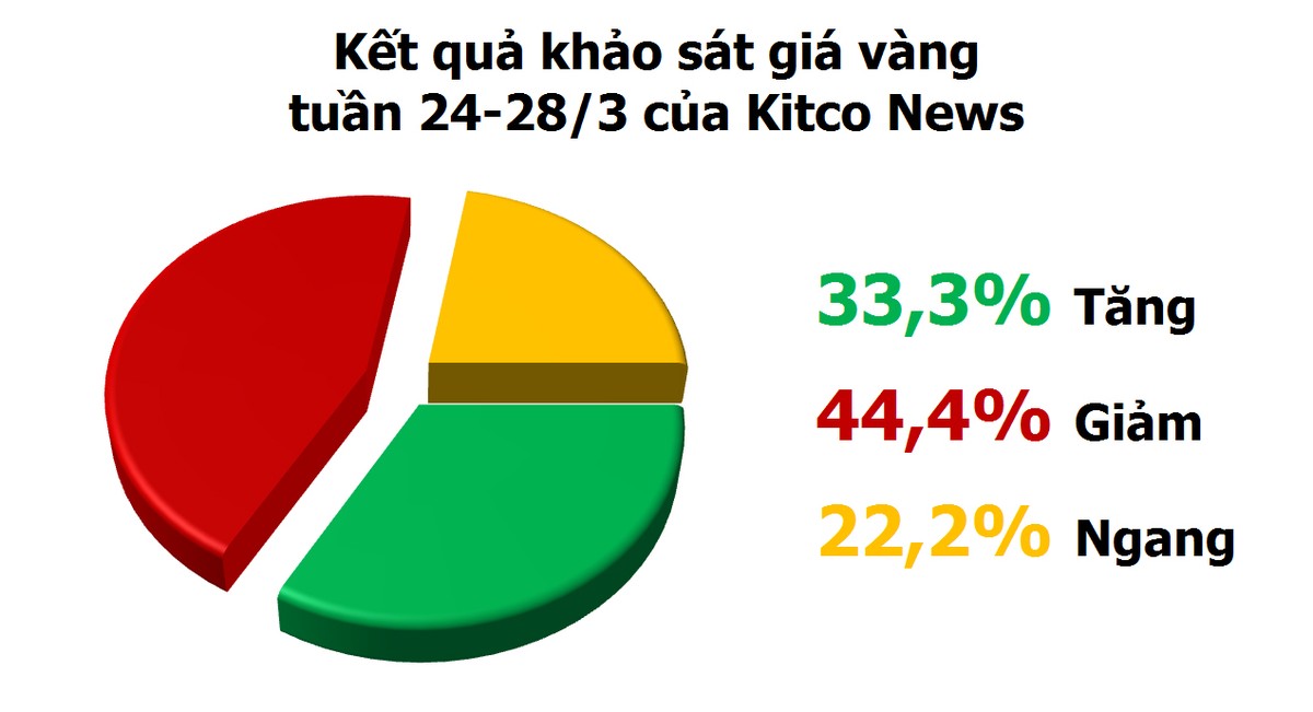 Theo khảo sát của Kitco News trên 33 thành viên thị trường vàng, có 18 người trả lời, trong đó, 6 người đoán giá tăng trong tuần tới, 8 người đoán giá giảm và 4 người đoán giá đi ngang
