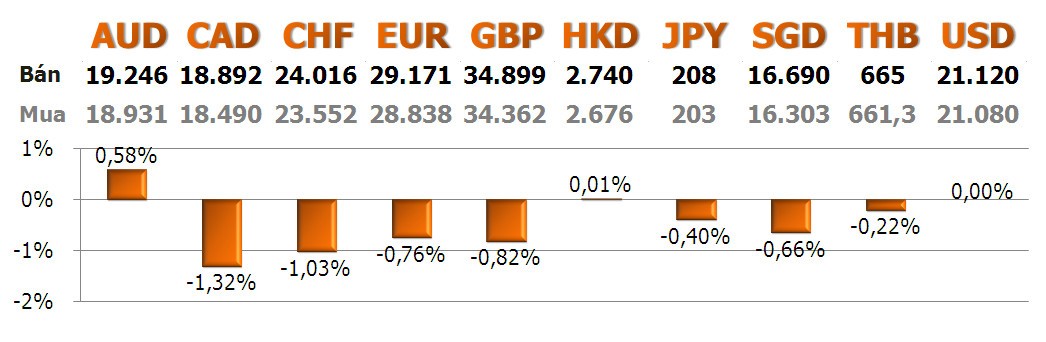 Các ngoại tệ khác, với việc giảm mạnh về cuối tuần, đã có một tuần giảm giá đồng loạt. Trong đó, CAD giảm mạnh nhất với -1,32%; tiếp đến là CHF với -1,03%; EUR với -0,76%; SGD với -0,66%... Ở chiều tăng, chỉ có AUD với 0,58%.