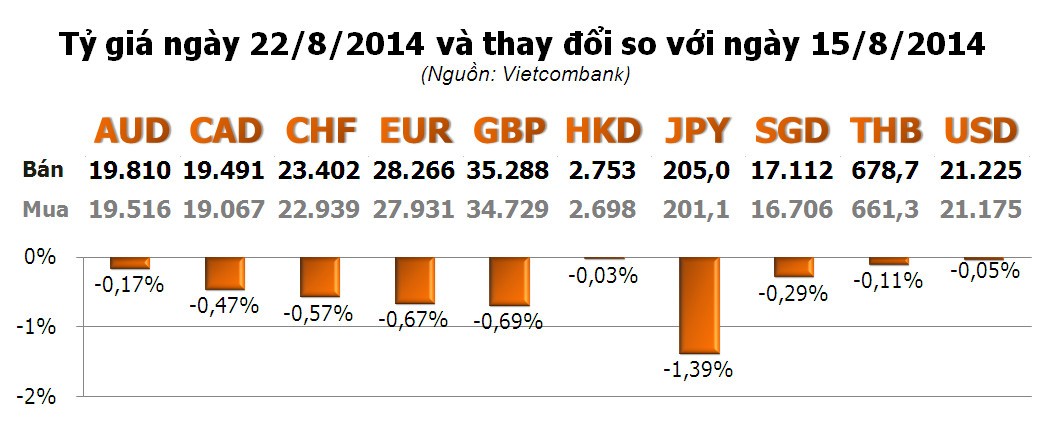 Các ngoại tệ khác đồng loạt giảm sau một tuần, trong đó, giảm mạnh nhất là JPY với -1,39%; tiếp đến là GBP với -0,69%; EUR với -0,67%...