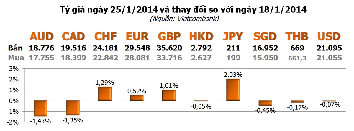 Với các ngoại tệ khác, cơ cấu tăng/giảm tương đối cân bằng trong tuần qua. Ở chiều tăng, JPY dẫn đầu với 2,03%; tiếp theo là CHF với 1,29%; GBP với 1,01%... Ở chiều giảm, AUD giảm mạnh nhất với 1,43%; tiếp đến là CAD với -1,35%.