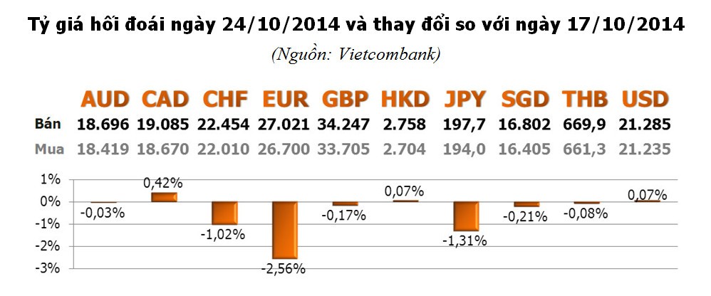 Các ngoại tệ khác hầu hết giảm. Trong đó, giám mạnh nhất là EUR của châu Âu với -2,56%, bỏ xa đồng tiền giảm thứ hai là JPY của Nhật với -1,31%; tiếp đến là CHF của Thụy Sỹ với -1,02%... Ở chiều tăng, chỉ có CAD của Canada đáng kể với 0,42%.