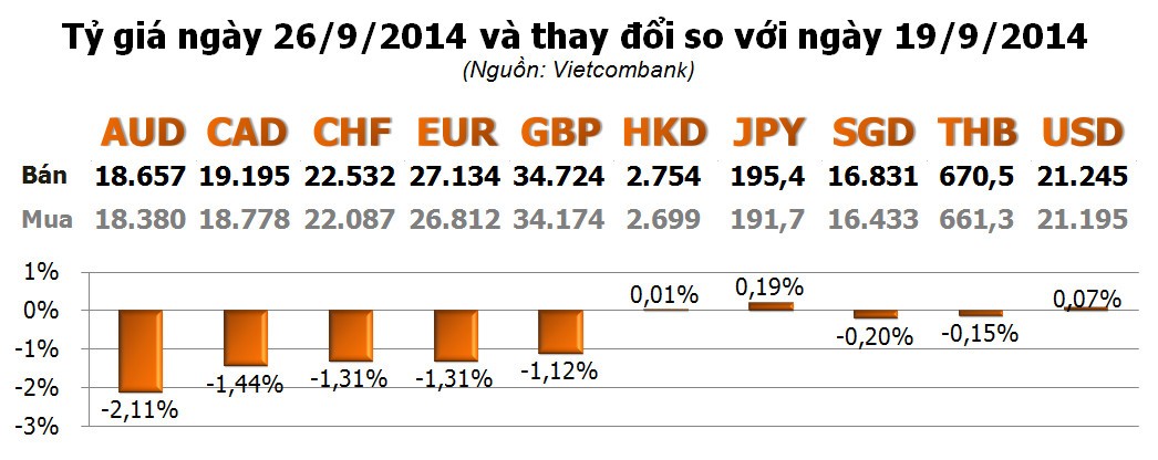 Với các ngoại tệ khác, các đồng tiền phương Tây đồng loạt giảm mạnh, trong khi các đồng tiền châu Á gần như không đổi. Giảm mạnh nhất là AUD với -2,11%; tiếp theo là CAD với -1,44%; EUR và CHF với cùng -1,31%...