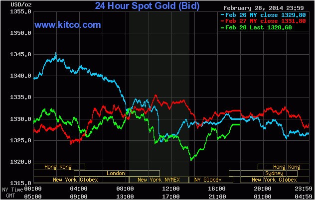 Giá vàng giao tháng 4 kết thúc phiên thứ Sáu tuần trước ở thế giảm, với 1.321,6 USD/ounce trên sàn Comex, giảm 0,15% so với tuần trước đó. Tính chung trong tháng 2, vàng đã tăng 6,6%. Giá vàng giao ngay chốt tuần qua ở mức 1.328,6 USD/ounce.