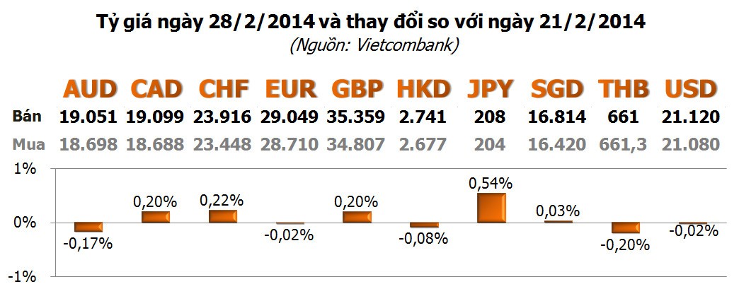 Trên thị trường quốc tế, cặp EUR/USD sau khi giảm giữa tuần đã bật tăng trong ngày cuối tuần trước thông tin IMF đang xúc tiến cho vay cứu trợ Ukraine, giúp đồng EUR hồi phục, trong khi chứng khoán Mỹ tăng điểm khiến nhu cầu nắm giữ USD làm tài sản an toàn ít đi, ép USD giảm giá. Chốt tuần, cặp tỷ giá này ở mức 1.3798, tăng so với mức thấp 1,3640 trong tuần và mức 1,3740 cuối tuần trước đó.