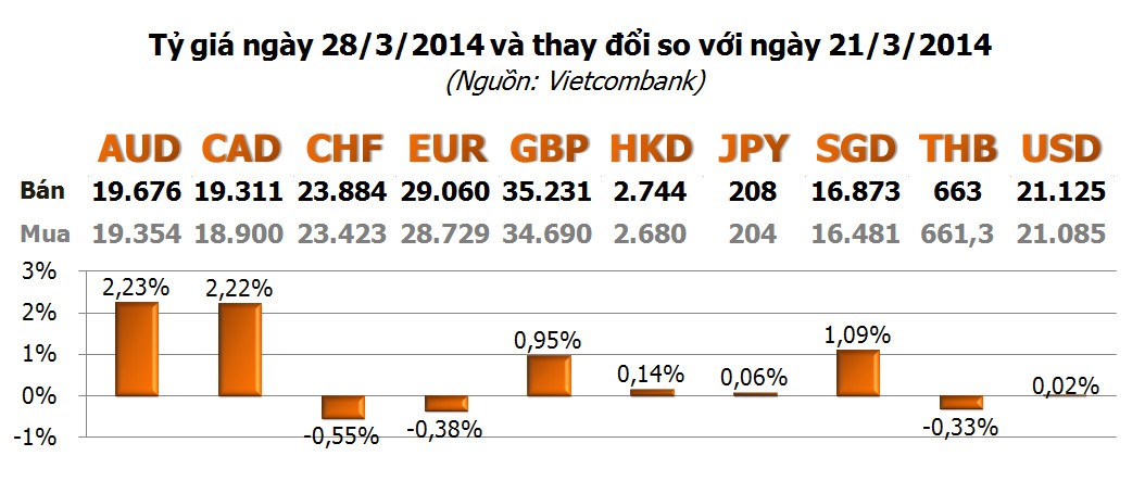 Với các ngoại tệ khác, trong khi một số tăng giảm bù trừ trong tuần khiến lũy kế không thay đổi nhiều so với tuần trước đó, các đồng tiền như AUD, CAD đã tăng mạnh với lần lượt 2,23% và 2,22%. Tiếp theo là GBP với 0,95% và SGD với 1,09%. Ở chiều giảm, dẫn đầu là CHF với -0,55%, rồi đến EUR với -0,38%; THB với -0,33%.