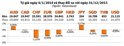Các ngoại tệ khác, đa số giảm. Trong đó CHF giảm mạnh nhất với -1,22%; tiếp đến là EUR, giảm 0,99%; GBP giảm 0,99%... Ở chiều tăng, chỉ có JPY và AUD với mức tăng lần lượt là 0,77% và 0,56%.
