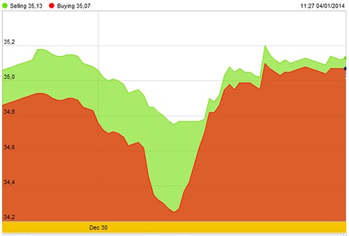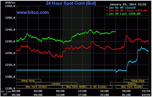 Phí mua vàng giao ngay tại Trung Quốc, nước nhập khẩu vàng lớn nhất thế giới, là 20 USD/ounce vào ngày 3/1, cao hơn nhiều so với mức bình quân 15,35 USD/ounce của tháng 12/2013. Theo dữ liệu của Sở giao dịch vàng Istanbul (Thổ Nhĩ Kỳ), nước này đã tăng 64% lượng nhập khẩu vàng trong tháng 12/2013. Hôm 31/12, giá vàng giao tháng 2 trên thị trường New York là 1.181,4 USD/ounce, thấp nhất kể từ tháng 6/2013.