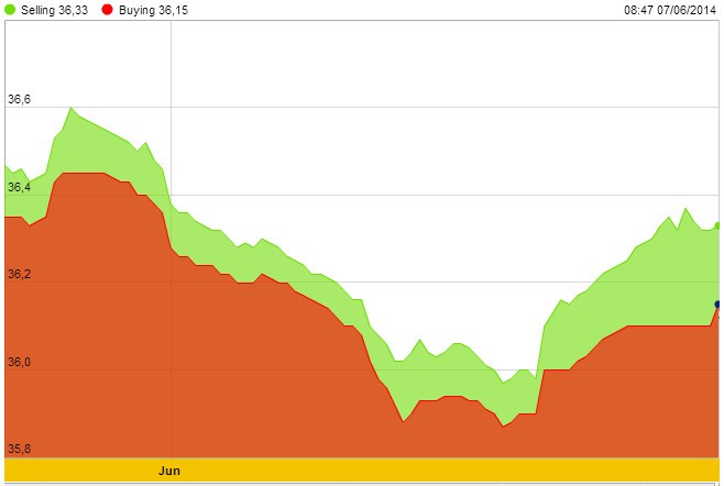 Trong khi đó, giá USD do Vietcombank niêm yết đã tăng kịch trần ở giá bán (21.246 đồng/USD) vào ngày 5/6, trước khi giảm đột ngột 26 đồng ở giá mua, 36 đồng ở giá bán trong ngày cuối tuần 6/6. Tuy nhiên, các mức giá này vẫn cao hơn 30 đồng so với cuối tuần trước đó.