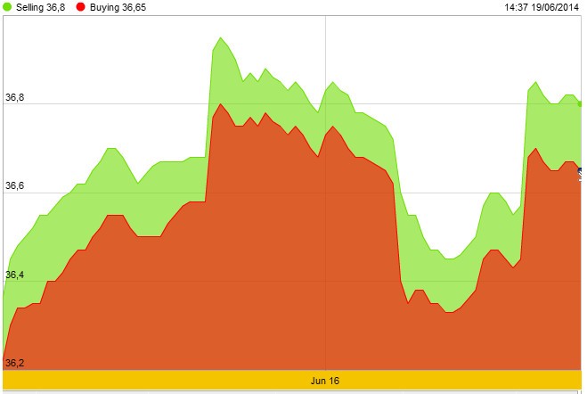Hôm nay, 19/6/2014, tỷ giá bình quân liên ngân hàng giữa đồng Việt Nam và đô la Mỹ chính thức được Ngân hàng Nhà nước nâng từ mức 21.036 VND/USD lên 21.246 VND/USD (mức điều chỉnh 1%). Với biên độ tỷ giá +/- 1% so với tỷ giá bình quân liên ngân hàng, tỷ giá trần là 21.458 VND/USD, tỷ giá sàn là 21.034 VND/USD.