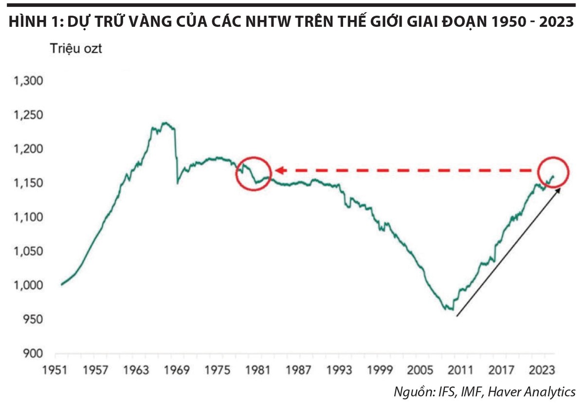 Sự phát triển nhanh chóng của nền kinh tế các nước sau Thế chiến II đã thúc đẩy cầu tiền tăng nhanh, vượt quá khả năng cung ứng vàng trên thế giới. Các nước đều tăng cung tiền để đáp ứng nhu cầu tiền tệ của nền kinh tế, nhưng lượng vàng dự trữ không thể tăng tương ứng, nên càng khuyến khích nhu cầu đầu cơ vàng. Sức ép phá giá vàng ngày càng tăng và đến năm 1971, Mỹ chính thức tuyên bố từ bỏ hệ thống Breton Woods và thả nổi đồng USD. Vai trò siêu tiền tệ của vàng chấm dứt, các NHTW chấm dứt thời kỳ tăng tích lũy vàng và liên tục giảm dự trữ vàng. Mức dự trữ vàng tại các NHTW chạm đáy năm 2010 (Hình 1).