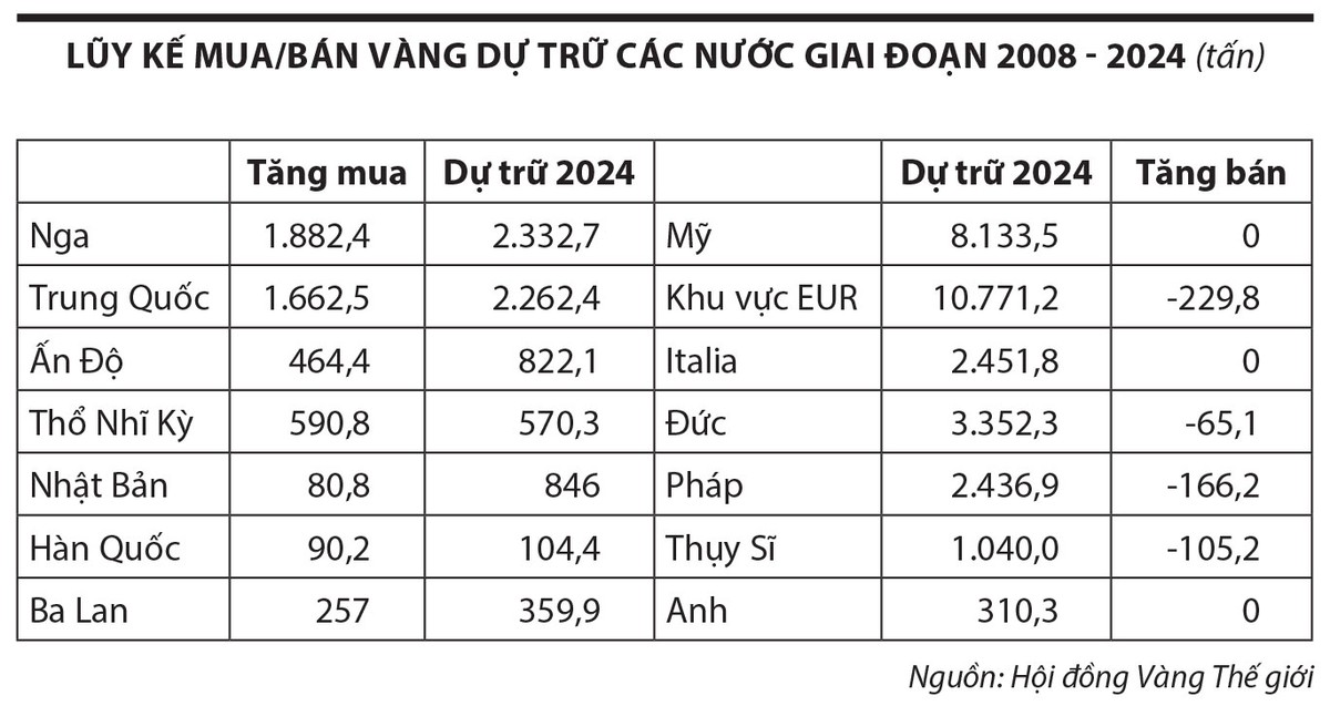 Từ năm 2008 đến nay, các NHTW trên thế giới tăng dự trữ vàng, nhưng chủ yếu tập trung vào một số nước như Nga, Trung Quốc, Ấn Độ, Thổ Nhĩ Kỳ. Riêng 4 nước này đã chiếm 72,1% tổng mức dự trữ vàng tăng thêm trên toàn thế giới lũy kế từ năm 2008 đến tháng 3/2024 (Bảng 1).
