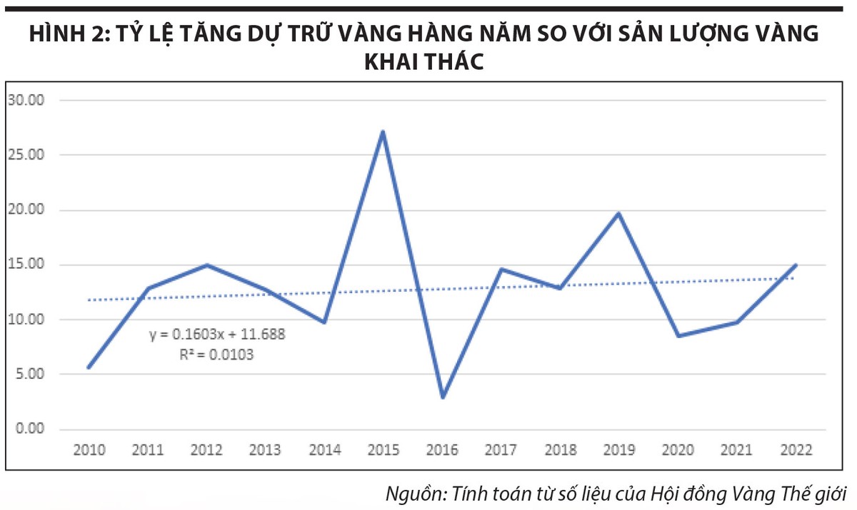 Từ năm 2010 đến nay, tỷ lệ vàng được dự trữ so với sản lượng vàng khai thác trong năm có xu hướng tăng nhẹ từ khoảng 11,7% lên 13,8%. Như vậy, phần lớn vàng khai thác trong năm (khoảng 87%) phục vụ cho mục đích phi tiền tệ, nếu xét trên góc độ từng quốc gia.