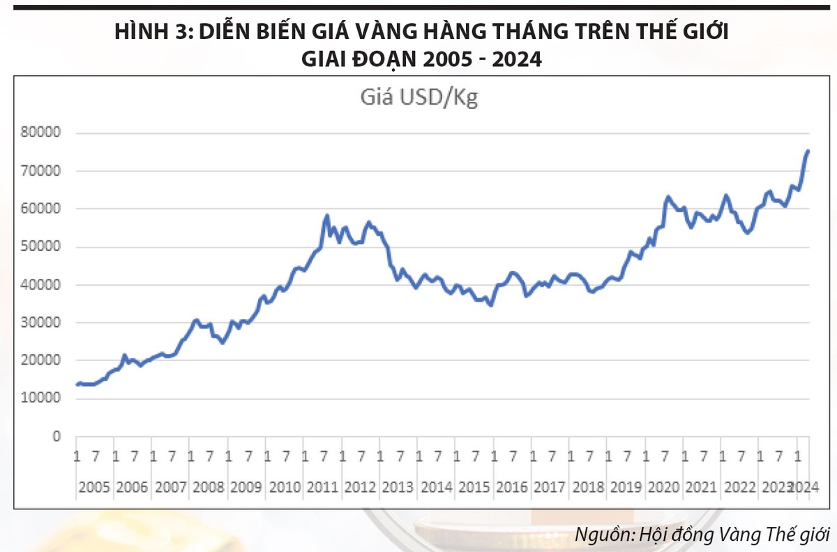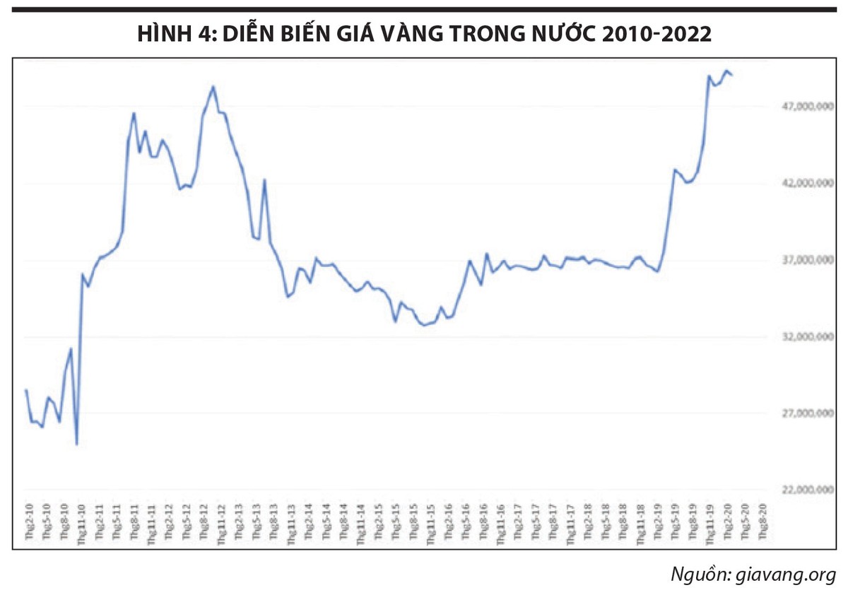 Giá vàng tại Việt Nam từ năm 2005 đến nay có hai giai đoạn tăng mạnh, đó là 2005 - 2011 và từ 2019 đến nay. Giai đoạn 2005 - 2011, giá vàng tăng xuất phát từ ba nguyên nhân chính: giá vàng thế giới liên tục tăng; chịu ảnh hưởng của khủng hoảng toàn cầu, tâm lý lo lắng tăng nên nhu cầu lưu giữ tài sản tăng; chịu ảnh hưởng của đợt phá giá tiền đồng năm 2010 (Hình 4).