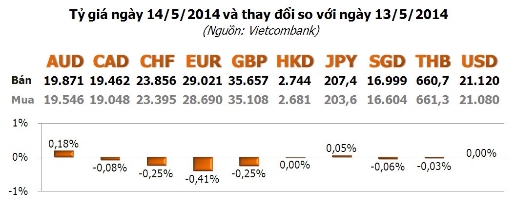Các ngoại tệ khác hầu hết tiếp tục giảm, mạnh nhất là EUR với -0,41%; tiếp đến là CHF và GBP với cùng -0,25%... Các ngoại tệ khác thay đổi không đáng kể.