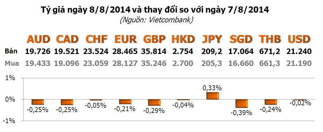 Các ngoại tệ khác, đa số lại giảm. Trong đó, giảm mạnh nhất là SGD với -0,39%; tiếp đến là GBP với -0,29%; AUD và CAD cùng -0,25%... Ở chiều tăng, duy nhất JPY với 0,33%.