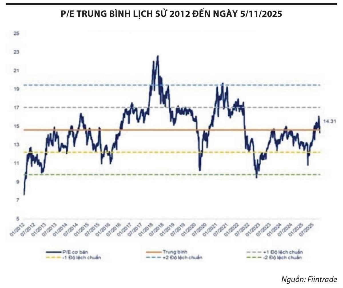 Tuần đầu tháng 11, VN-Index dao động trong vùng 1.600 - 1.650 điểm, tương ứng với mức P/E quanh 14 lần, P/B quanh mức 2 lần - mức trung bình 10 năm, một mức không còn rẻ. Đây là kết quả của đà tăng khá tích cực của VN-Index trong hơn 10 tháng đầu năm 2025, gần như tăng ròng rã trong cả quý II và quý III và chỉ chững lại từ đầu quý IV tới nay. Đóng góp chính trong đà tăng mạnh của VN-Index là nhóm cổ phiếu họ Vin, Gelex, VietJet và nhóm tài chính. Ước tính, nhóm này đóng góp khoảng 400 điểm cho VN-Index trong năm 2025; các nhóm ngành còn lại đang giao dịch ở vùng VN-Index quanh mức 1.250 - 1.300 điểm, tương đương với mức định giá P/E 12 lần.
