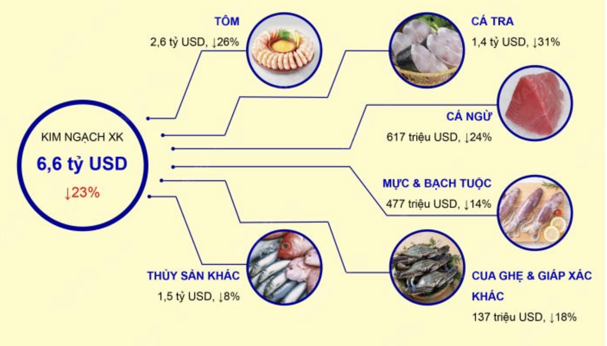 Xuất khẩu thủy sản sang những thị trường tiêu thụ lớn như Mỹ, EU, Trung Quốc, Hàn Quốc đều giảm từ 17 - 34%, trong khi xuất khẩu sang Nhật Bản giảm ít hơn với 13%.