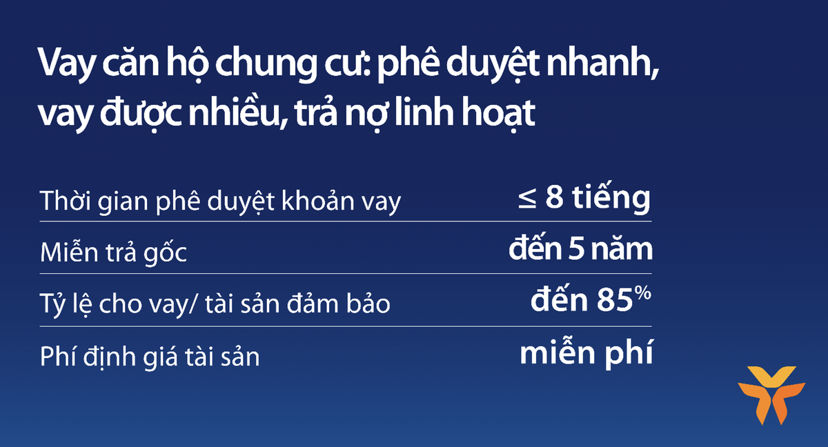 Đặc biệt, với giải pháp vay căn hộ chung cư có đặc tính vay nhanh trả dễ ra mắt lần này, VIB mang đến đặc quyền không cần trả gốc đến 5 năm. Sau thời gian này, khách hàng có thể linh hoạt trả gốc định kỳ đến 6 tháng/lần. Theo đại diện VIB, khoản vay với mức lãi suất ưu đãi thuộc hàng tốt nhất trên thị trường và đặc quyền không cần trả nợ gốc trong 5 năm đầu, sẽ giúp khách hàng giảm nhẹ áp lực tài chính khi sở hữu căn hộ chung cư.