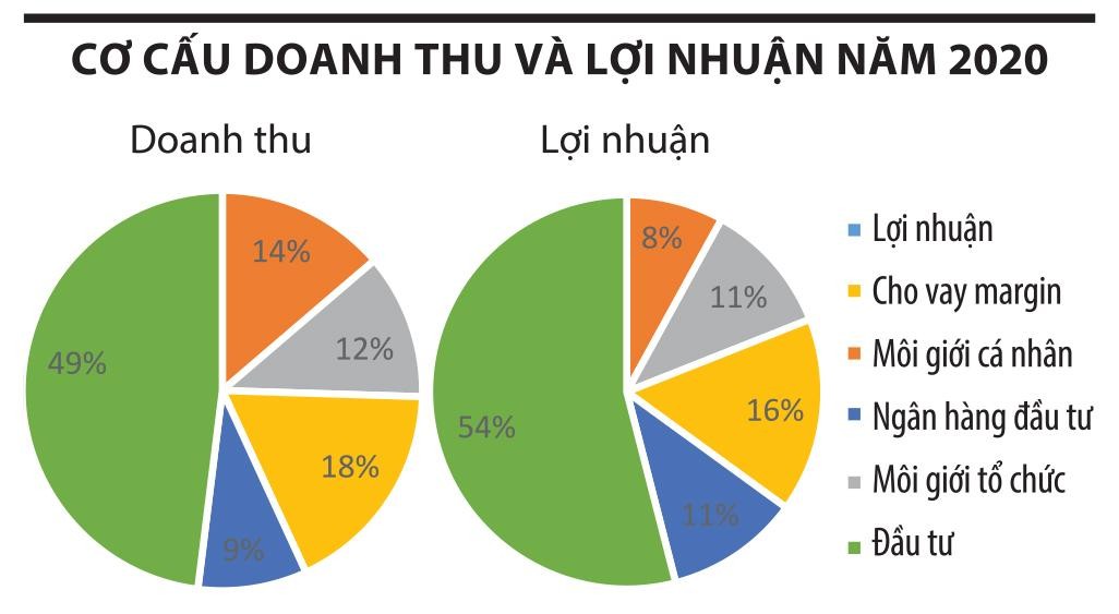 Với mảng đầu tư, quý IV/2020 ghi nhận doanh thu 331 tỷ đồng và lãi trước thuế 200 tỷ đồng, tăng tương ứng 57% và 49% so với cùng kỳ 2019. Trong kỳ, VCSC đã tăng tỷ lệ sở hữu tại TCB, VPB, MBB và IJC, đồng thời giảm vị thế tại SCR và DIG. Tính chung cả năm, mảng này ghi nhận doanh thu 842 tỷ đồng và lãi trước thuế 514 tỷ đồng, tăng lần lượt 20% và 30% so với năm 2019.
