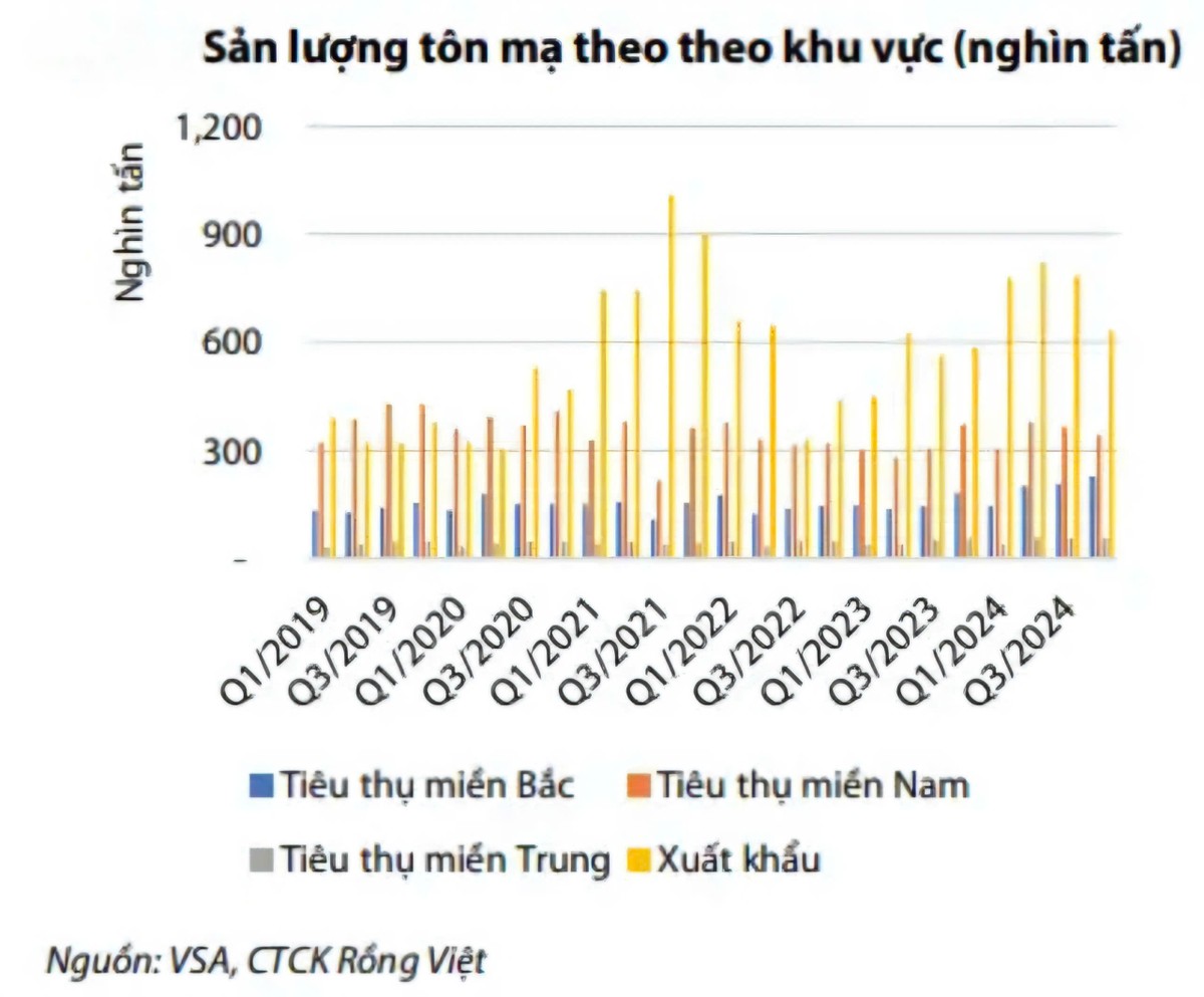 Đối với ngành thép trong nước, sau giai đoạn đầu năm tăng trưởng tốt về cả xuất khẩu và thị trường nội địa, VDSC dự báo thị trường nội địa sẽ duy trì tăng trưởng ổn định, trong khi xuất khẩu sẽ có sự sụt giảm trong quý IV/2024. Nhóm phân tích dự phóng sản lượng ngành tôn mạ sẽ đạt 1,3 triệu tấn trong quý IV/2024, tăng 26,9% so với cùng kỳ (trong khi quý III/2024 là hơn 1,4 triệu tấn). Tính chung cả năm 2024, VDSC dự phóng sản lượng nội địa có thể đạt 2,4 triệu tấn (tăng 16,5%) và xuất khẩu đạt 3 triệu tấn (tăng 36,5%).