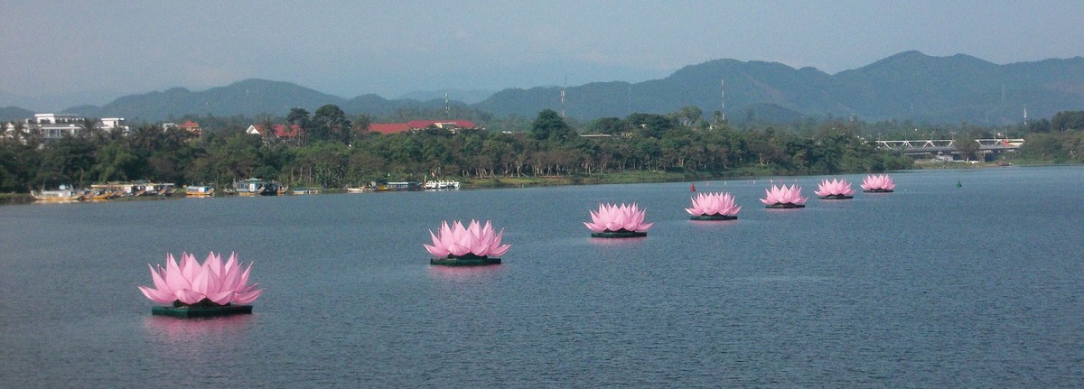 Bảy đóa sen khổng lồ trên sông Hương tượng trưng cho bảy bước đi thanh tịnh của Đức Phật. Ảnh: Nguyễn Văn Toàn