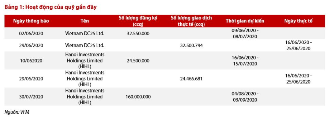 Chứng khoán Rồng Việt (VDSC) dẫn báo cáo bất thường của Quỹ VFMVSF do Công ty Quản lý quỹ VFM quản lý cho biết, sau khi thông báo đăng ký mua vào đầu tháng 6/2020, trong khoảng thời gian từ 16 - 25/6/2020, 2 quỹ có pháp nhân là quỹ ngoại gồm Vietnam DC25 Ltd. và Hanoi Investment Holdings Limited (HIHL) đã mua vào mua lần lượt là 32,5 và 24,5 triệu chứng chỉ quỹ VFMVSF, tương đương gần 410 tỷ đồng tại NAV ngày 2 và ngày 9/6.