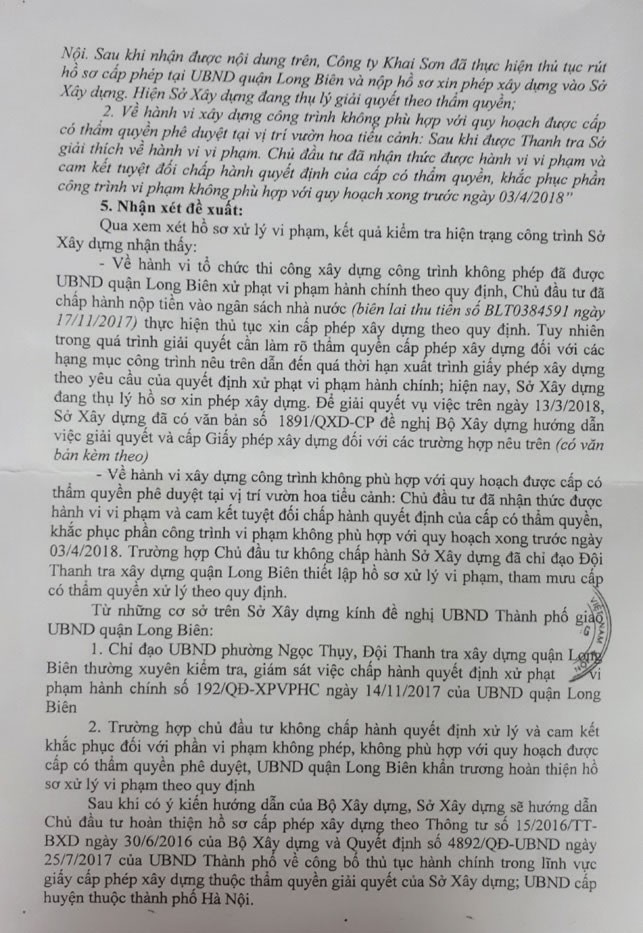 Cụ thể, làm việc với phóng viên Báo Đầu tư Bất động sản sau khi có sự ủy quyền của lãnh đạo Sở Xây dựng, ông Đặng Thành Long, Phó trưởng phòng Kế hoạch Tổng hợp (Thanh tra Xây dựng Hà Nội) cho biết: “Sai phạm tại dự án Khai Sơn đã được UBND quận Long Biên lập hồ sơ xử phạt và yêu cầu sau 60 ngày phải có giấy phép xây dựng”.