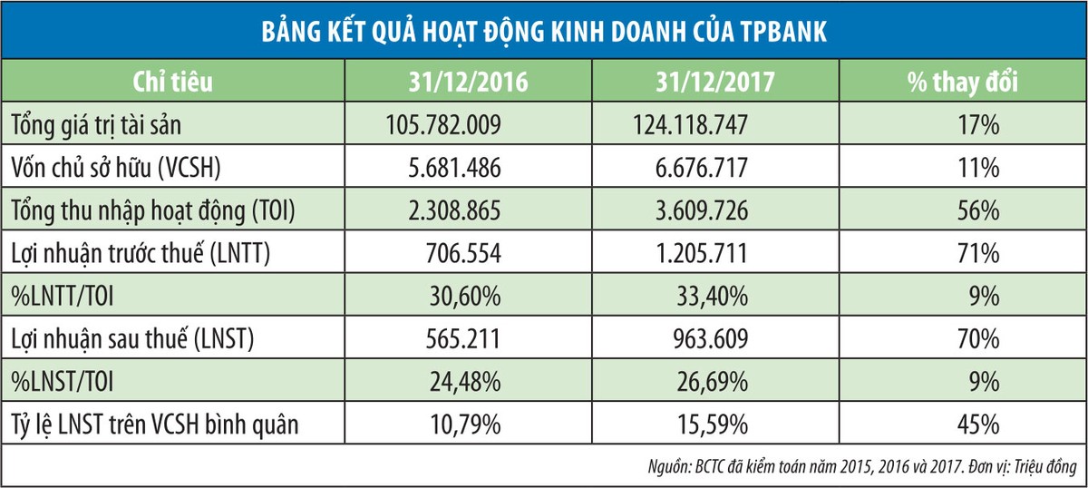 Theo đó, tổng thu nhập hoạt đồng thuần năm 2017 của TPBank đạt 3.609 tỷ đồng, trong đó thu nhập lãi thuần chiếm tỷ trọng cao nhất 88%, tương đương với 3.172 tỷ đồng. Thu nhập thuần ngoài lãi đạt 437 tỷ đồng, chiếm 12%. Lợi nhuận trước dự phòng rủi ro tín dụng đạt 1.668 tỷ đồng (năm 2017 trích lập 462 tỷ đồng). Nhờ việc đa dạng hóa các sản phẩm, dịch vụ cung cấp, đồng thời tăng cường tập trung vào phân khúc có tỷ lệ lãi cao, nâng cao chất lượng tài sản và hiệu quả trong việc huy động vốn và sử dụng nguồn vốn, giúp cho tổng thu nhập hoạt động thuần của TPBank tăng nhanh.