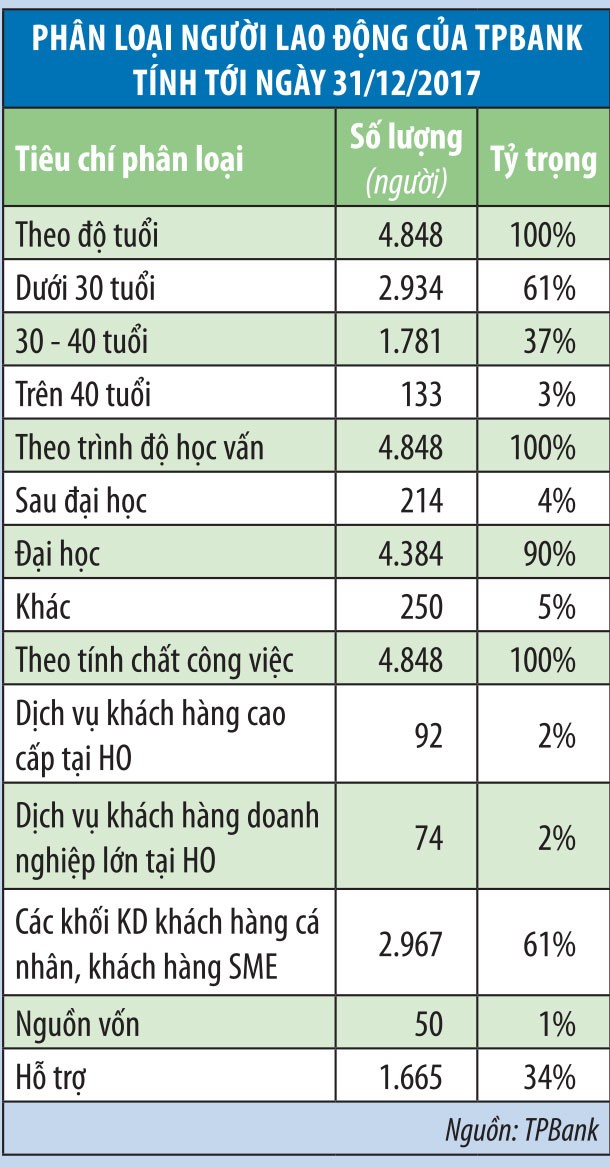 Nhân sự là một trong những thế mạnh của ngân hàng. Được biết, tính tới ngày 31/12/2017, tổng số lao động tại TPBank hiện có là 4.848 người lao động (năm 2016 là 3.937 người, tăng 23,1%). Thu nhập bình quân đầu người của mỗi nhân viên TPBank năm 2017 là 178,32 triệu đồng/người (năm 2016 là 129,66 triệu đồng/người, tăng 37,5%).
