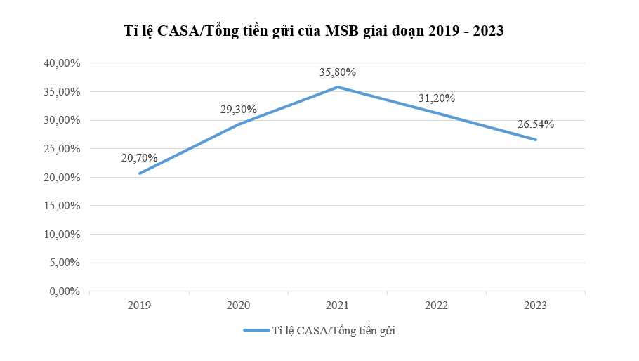 Trong 5 năm trở lại đây, chỉ số này của MSB luôn ghi nhận ở mức hiệu quả, thuộc top đầu ngân hàng sở hữu CASA/tổng tiền gửi cao nhất ngành. Năm 2023, MSB đứng thứ 4 thị trường với kết quả 26,54%, tương đương hơn 35.000 tỷ đồng tiền gửi không kỳ hạn. Tỷ trọng CASA đến từ khách hàng cá nhân và doanh nghiệp vừa và nhỏ (SME) – tệp khách hàng chiến lược của MSB – lần lượt đạt mức tăng trưởng 27,7% và 29,2% so với năm 2022.