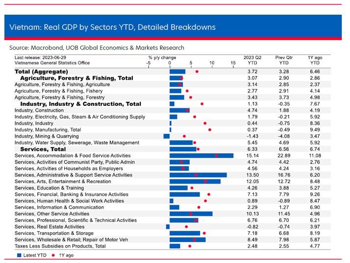 Theo dữ liệu do Tổng cục Thống kê (GSO) công bố vào ngày 29/6, tốc độ tăng trưởng GDP thực tế của Việt Nam trong quý II/2023 đã tăng lên 4,14% so với cùng kỳ, vượt xa mức dự báo chung là 3,8% nhưng thấp hơn kỳ vọng của UOB là 5,9%. Nguyên nhân chính dẫn đến kết quả tăng trưởng ảm đạm tiếp tục là do hoạt động sản xuất và nhu cầu bên ngoài sụt giảm.