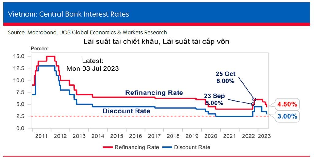 "Trước đó, chúng tôi đã dự kiến việc cắt giảm lãi suất 100 điểm cơ bản trong nửa đầu năm 2023. Với những hành động này, NHNN đã thiên về chính sách nới lỏng hơn và nhiều khả năng sẽ có thể tiếp tục hạ lãi suất trong quý III/2023", UOB nhận định và dự đoán lãi suất sẽ giảm thêm 100 điểm cơ bản trong quý III/2023 trước khi NHNN tạm dừng để đánh giá các tác động”, UOB nhận định.