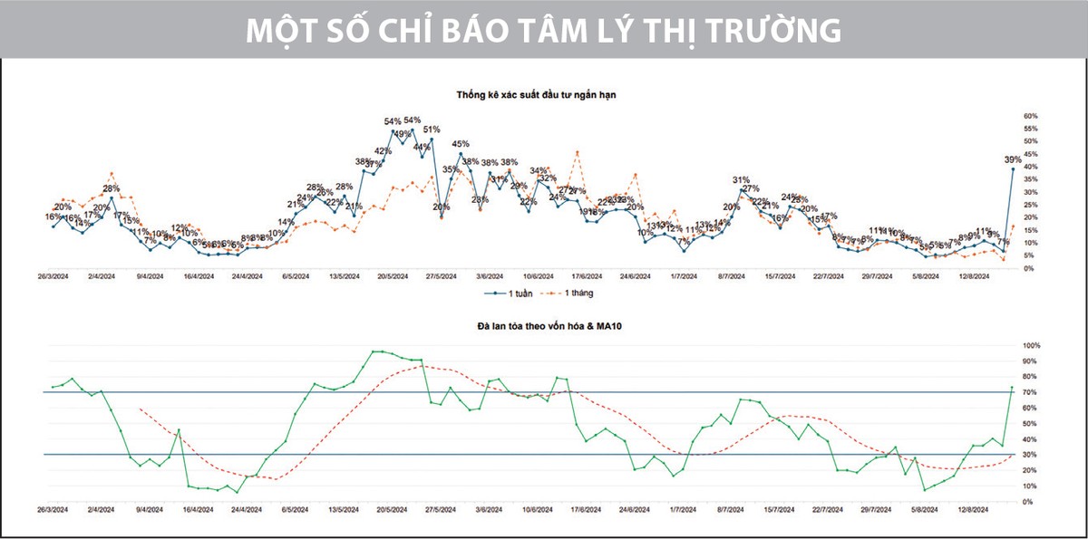 Sự lan tỏa của dòng tiền đến hầu hết các nhóm ngành, với sức mạnh vượt trội thể hiện trên nhóm cổ phiếu bất động sản, chứng khoán khi có nhiều cổ phiếu tăng trần và mở ra một phiên bùng nổ theo đà (FTD) sau 9 phiên hồi phục kể từ ngày 5/8/2024 đầy đủ về cả về chất và lượng. Cây nến tăng điểm xanh đặc cuối tuần đã bao trùm 90% cây nến giảm điểm ngày 1/8, cho thấy áp lực cung được hấp thụ tốt và nhà đầu tư chấp nhận trả giá cao hơn để sở hữu cổ phiếu. Theo đó, xu hướng tăng trở lại đang được ủng hộ, VN-Index tiến tới ngưỡng cản gần nhất quanh mốc 1.260 điểm (MA50, MA100).