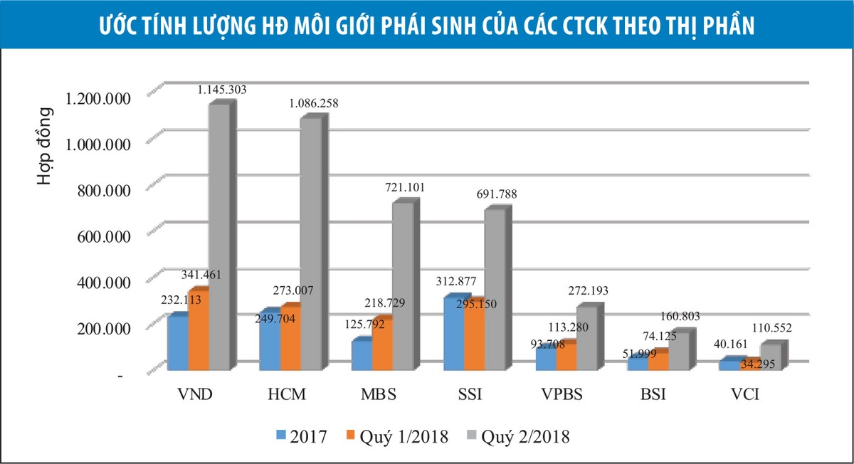 Số liệu của HNX cho biết, trong tháng 5/2018, đã có 1,64 triệu hợp đồng tương lai giao dịch thành công, tăng 191,17% so với tháng 4/2018. Trong tháng 6/2018, mức tăng là 20,9% với 1,98 triệu hợp đồng. Với thực tế giao dịch tập trung ở các kỳ hạn ngắn và giả định phí bình quân khoảng 10.000 đồng/hợp đồng, tổng doanh thu của các công ty chứng khoán từ môi giới phái sinh có thể đạt 16 - 20 tỷ đồng/tháng. Riêng trong tháng 7/2018, với khối lượng tăng vọt lên 2,84 triệu hợp đồng, tương ứng khoảng 28 tỷ đồng, mỗi công ty chứng khoán top đầu thị phần như VNDS, HCM, MBS có thể “bỏ túi” doanh thu từ 5 - 7 tỷ đồng tiền phí.