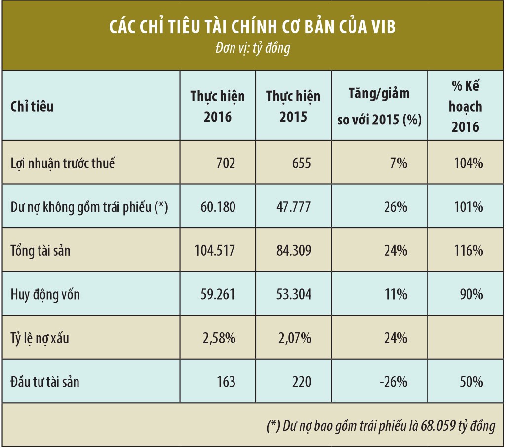 Năm 2016, VIB đã đạt được nhiều thành tựu trên cơ sở phát triển bền vững, an toàn hiệu quả; trong đó, chú trọng việc duy trì, phát triển nguồn doanh thu có tính bền vững, quản lý chi phí và quản trị rủi ro hiệu quả: Lợi nhuận trước thuế đạt 702 tỷ đồng, đạt 104% kế hoạch được cổ đông giao phó. Tính đến cuối năm 2016, tổng tài sản của VIB đạt 104.500 tỷ đồng, đạt 116% kế hoạch; tăng trưởng tín dụng đạt xấp xỉ 70.000 tỷ đồng, tăng 25% trong 2 năm liên tiếp.