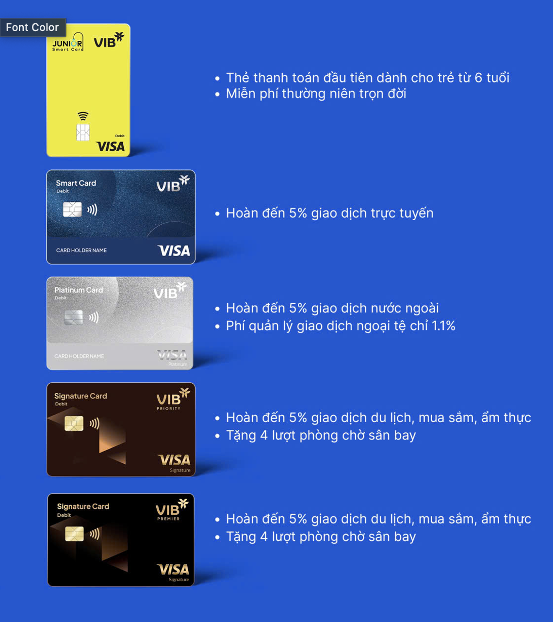Với 5 dòng thẻ riêng biệt, bộ thẻ thanh toán quốc tế VIB là giải pháp chi tiêu hiện đại cho mọi phân khúc khách hàng, từ trẻ em, giới trẻ năng động đến khách hàng cao cấp với nhiều ưu điểm đột phá: